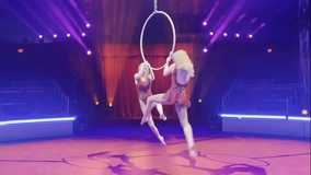 A breathtaking duo on aerial hoop, celebrated for elegance, unity, and fluidity, creating ethereal performances filled with striking shapes