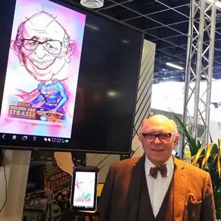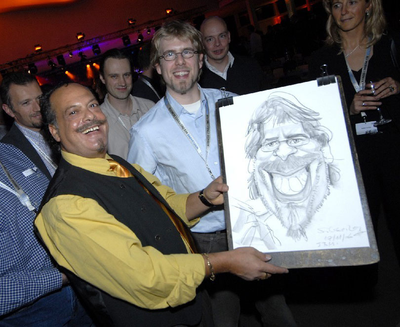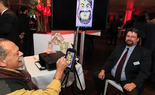 His vivid, life-like caricatures are created using chalk on paper, and are unique due to the amount of detail and shading that the artist includes. In just a few minutes he accurately captures the essence of the caricatured, creating a stunning piece of work that not only induces laughter in the present but in the years to come. As well as producing live caricatures with traditional materials, he can also create digital caricatures using a tablet, guests can watch in amazement as the works in progress are projected onto a screen. These digital caricatures can be emailed to friends instantaneously and are particularly lend themselves to trade fairs, conventions and corporate events.