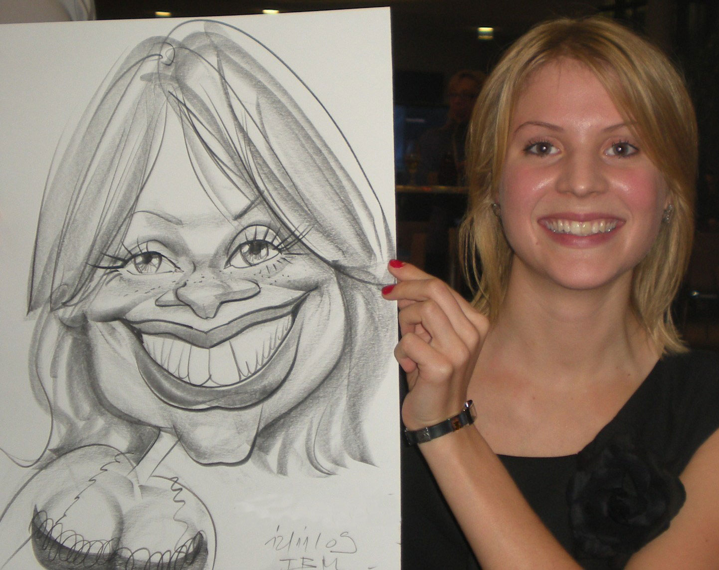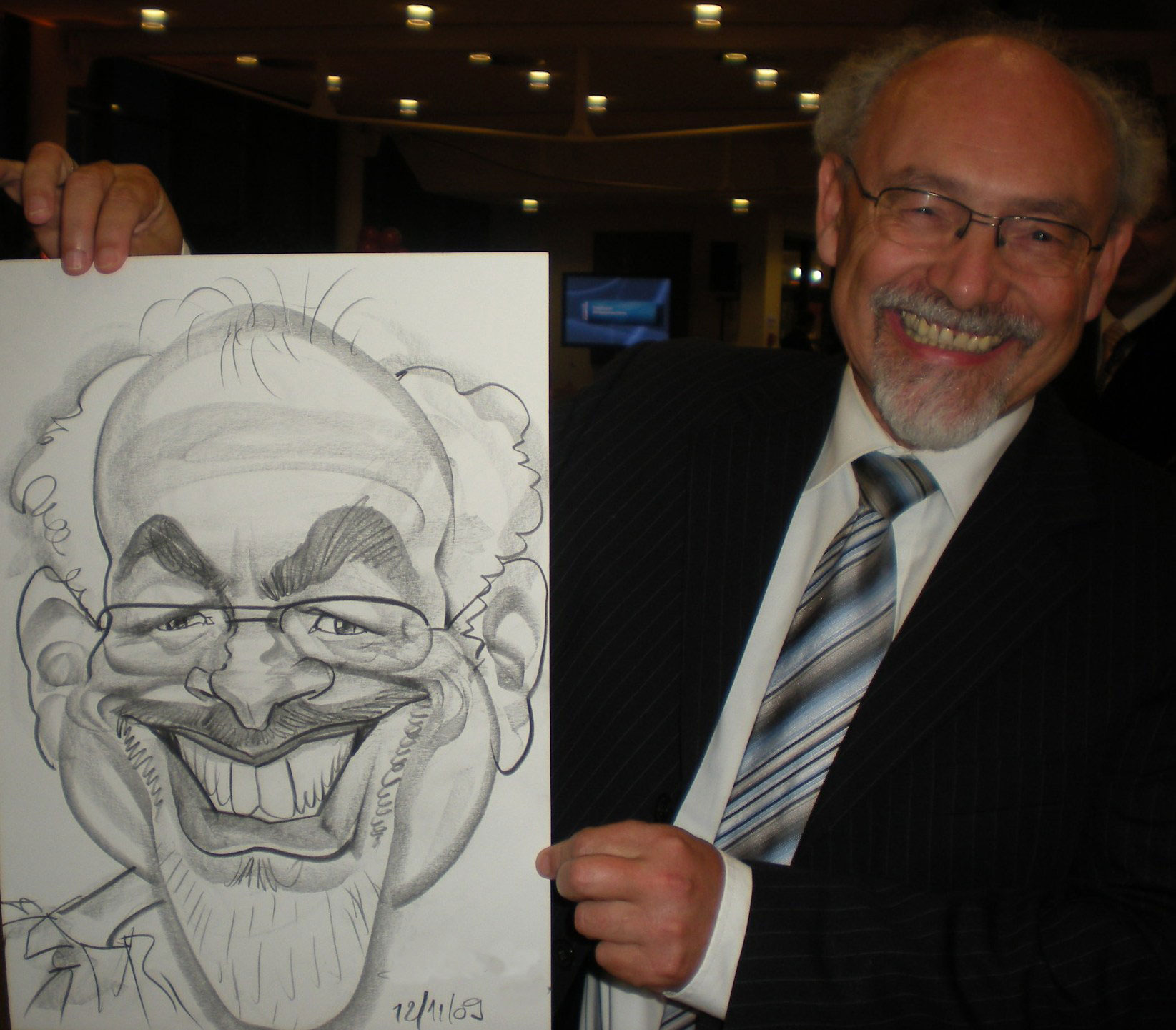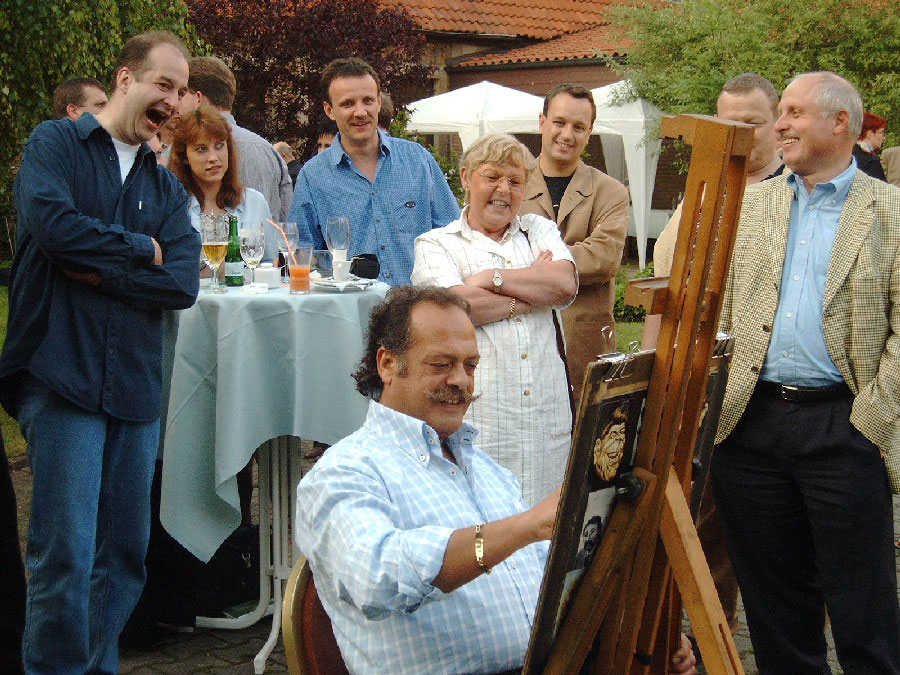 In addition to his live caricatures, he can also pre-prepare a full colour caricature of an individual or group using acrylics, which becomes the centre for a truly unique collage as he adds caricatures of guests to it during the event.