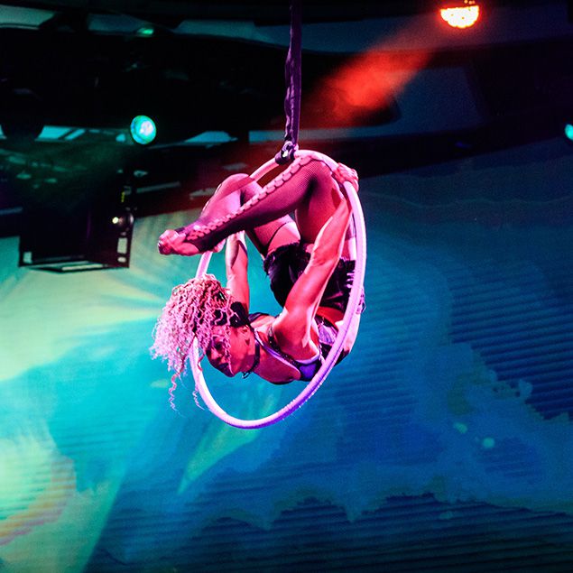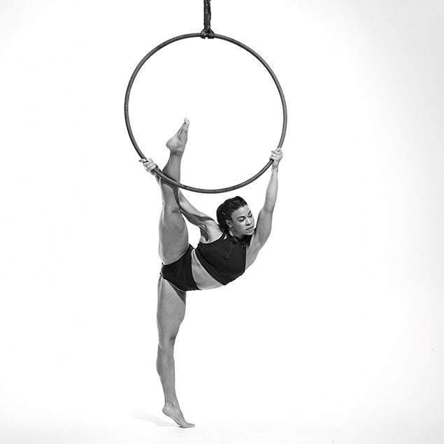 Dynamic cirque aerialist specializing in aerial hoop, blending technical precision with heartfelt expression for powerful, captivating performances