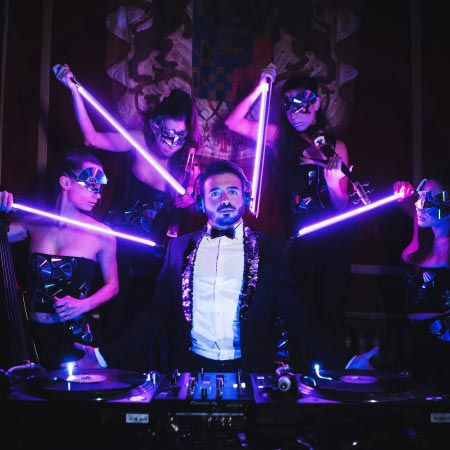 Their vast repertoire and large collection of elegant and extravagant costumes allows them to adjust to a variety of themes such as LED, vintage, pop, Latin, cultural, floral, theatrical, and many more. To make our artists even more memorable, they can perform with LED bows, creating a glowing spectacle that your guests will never forget.