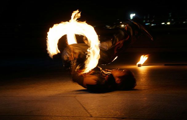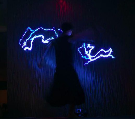 This stunning show can feature all the classical elements, including fire spinning and stunts (fire), water and sand illusion (water earth), visual poi (light), magic with small black numbered bricks/blocks (earth), Danny's signature razor blade illusion (steel/iron) and an optional laser act (light).