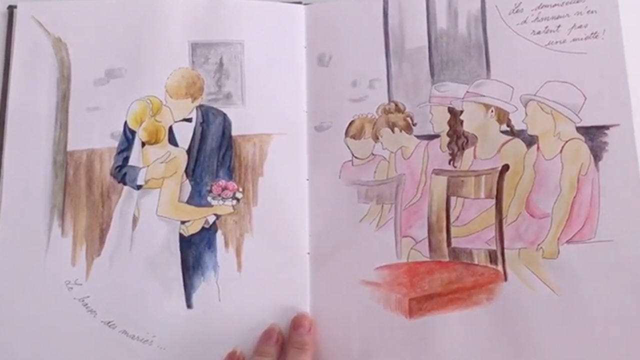 " What an originality! We are used to see photographers, sometimes caricaturists, but in this case … it’s a real novelty! [She] draws the wedding, capturing key moments and emotions are there! I recommend that, as an ideal wedding present! "