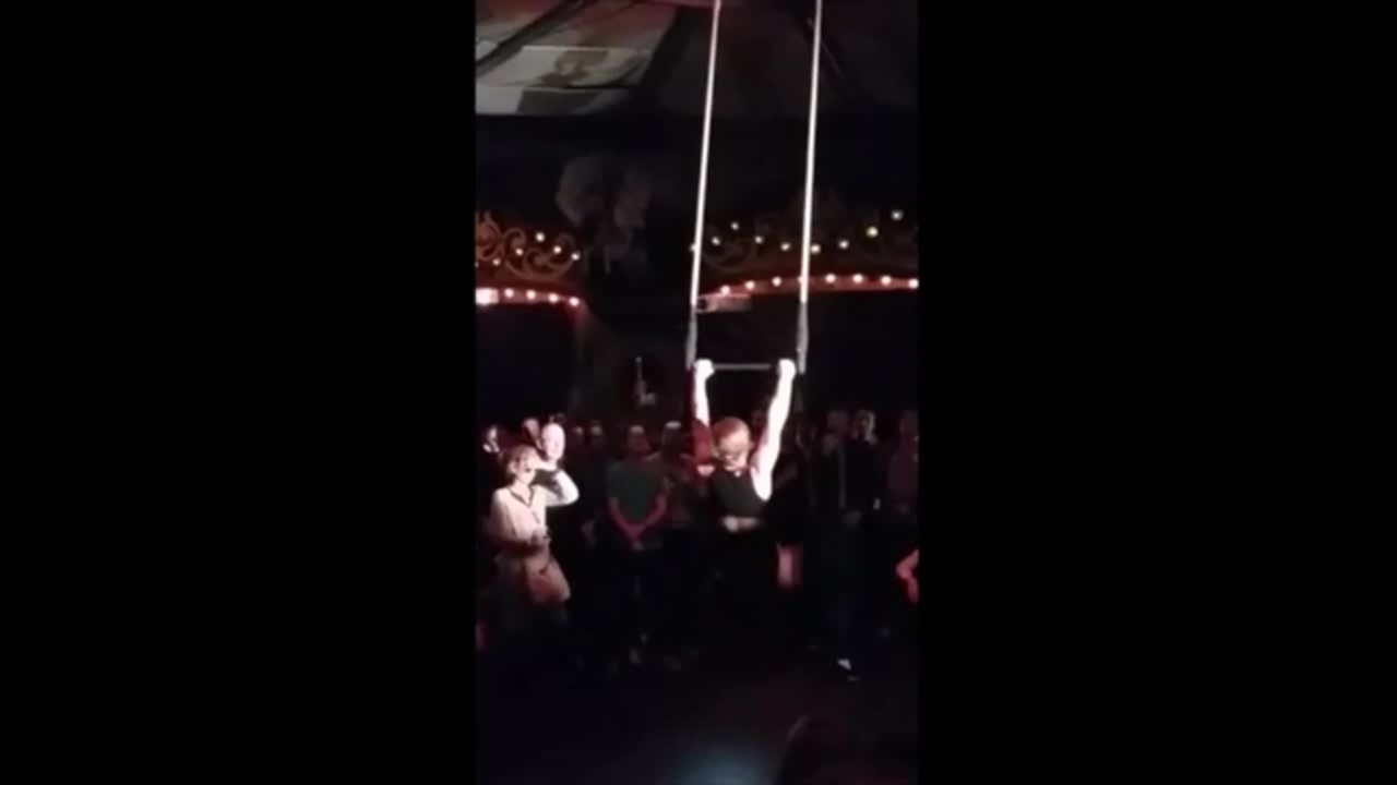 - Aerial Hoop: Using a large hoop suspending from the ceiling, the aerialist creates striking shapes as she sits in the middle or hangs from the prop.