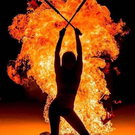 Her act is full of daring tricks and fire skills and incorporates fire fans, fire hoops, dragon staff, fire swords, double staves and fire eating