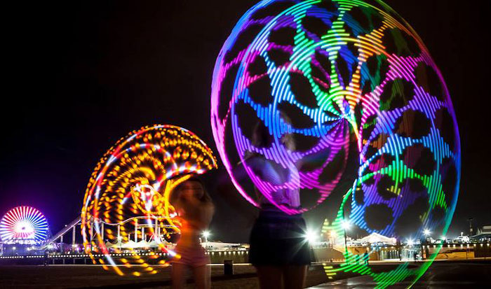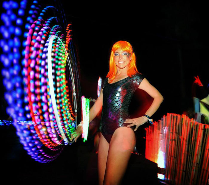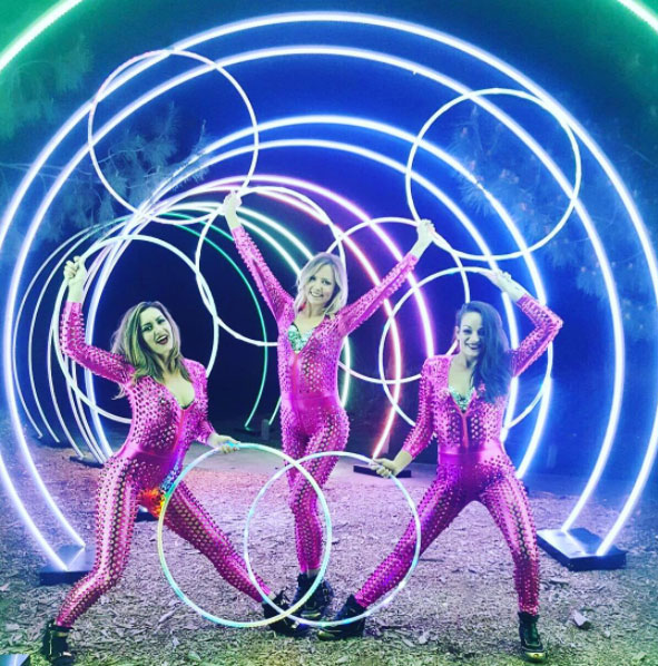Our stunning LED hula hoop dance girls are an amazing group of performers with fascinating moves, contemporary dance routines, beautiful synchronicity and sassy high energy. They offer incredible choreographed standar hoop, fire hoop or LED hula hoop dance routines that are spectacular unforgettable stage shows or multiple ambient hula hoop dance acts throughout an event. The ambient hula hoop dance performances can include other props such as veil fans and iridescent isis wings to keep the entertainment varied.