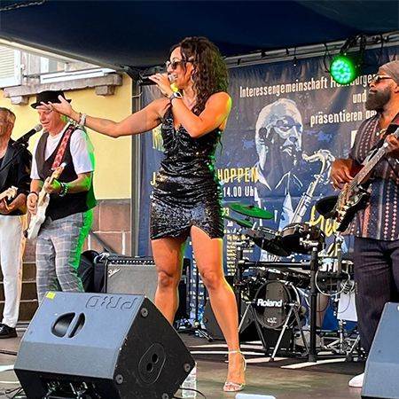 Her repertoire spans soul, R&B, disco, Motown, swing, pop, and rock, making her a versatile female vocalist for weddings, galas, and themed nights