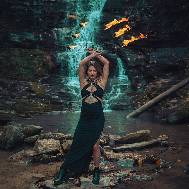 Palm torches, fire eating, and fire fans complete her fiery repertoire, offering mesmerizing visuals that captivate audiences with every movement