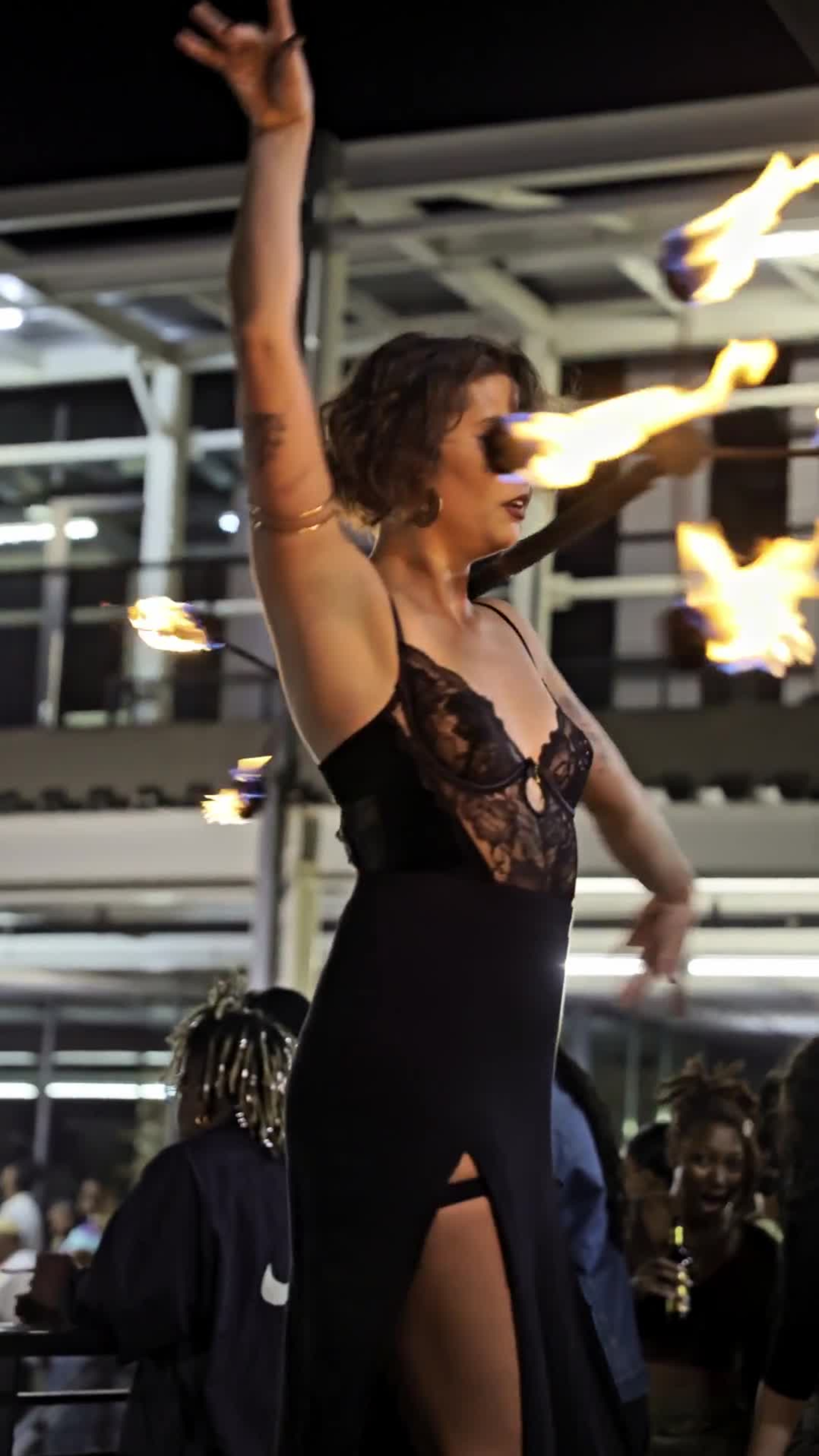 She performs with a dynamic range of fire apparatuses, showcasing skill, rhythm, and control while crafting visually stunning patterns of flame
