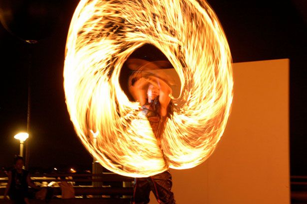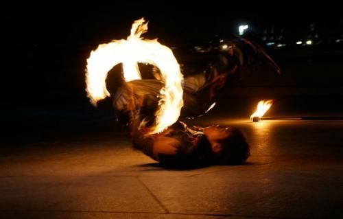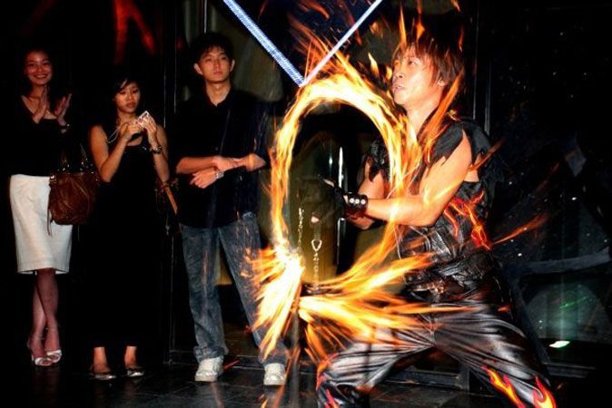Crowned “The Flame of Asia” by peers and fire art communities around the world, he is a respected teacher and exponent of the art of “Freedom Fire”, an original and highly flamboyant brand of fire and poi twirling incorporating both pseudo martial arts and hypnotic trance techniques based largely on exhilarating speed and power.