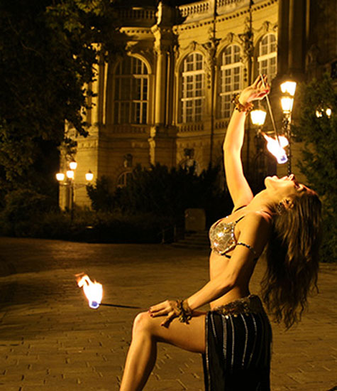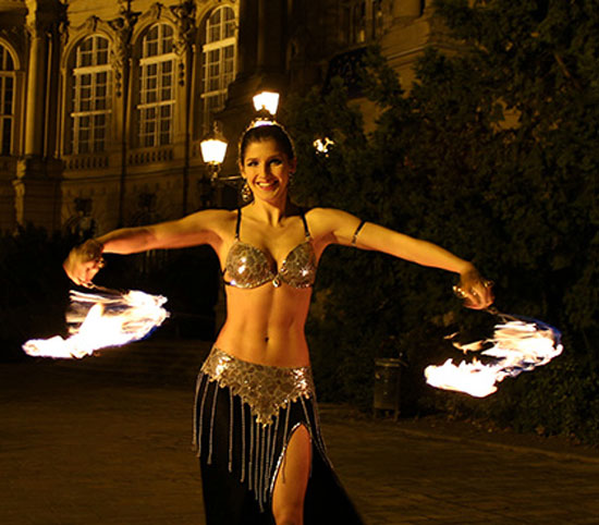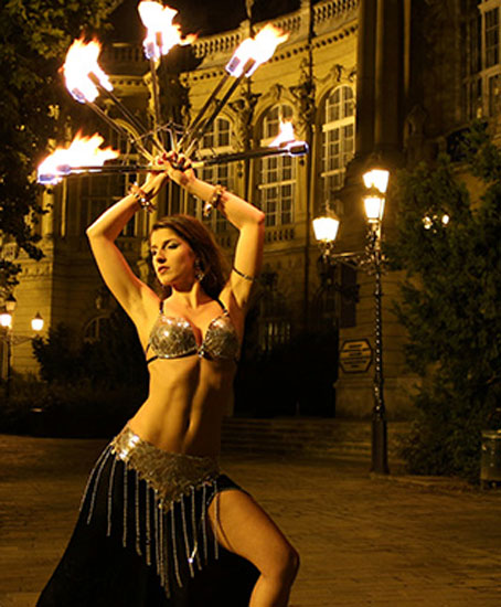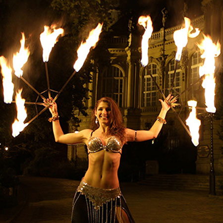 A beguiling show, our talented performer can incorporate a range of spectacular props and skills into her choreography including fire fans, flaming swords and fire eating. Able to adapt her performance to suit an audience or occasion, our versatile fire belly dancer can also custom design her choreography especially for your event.