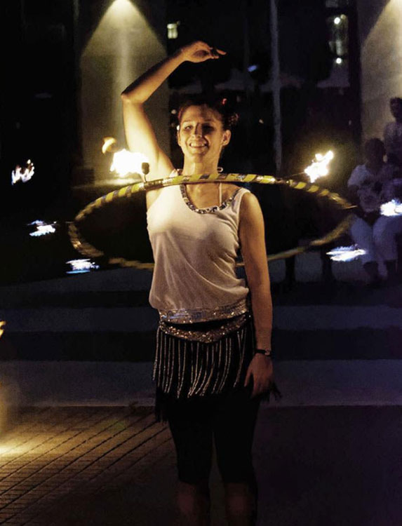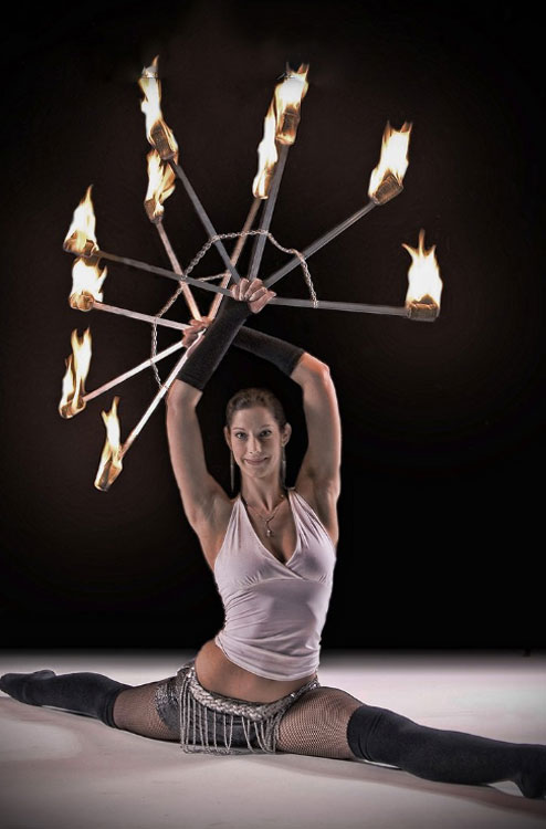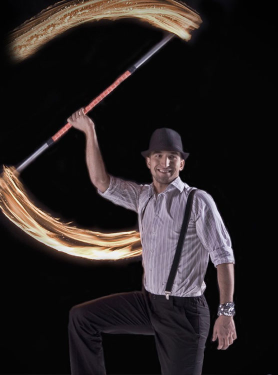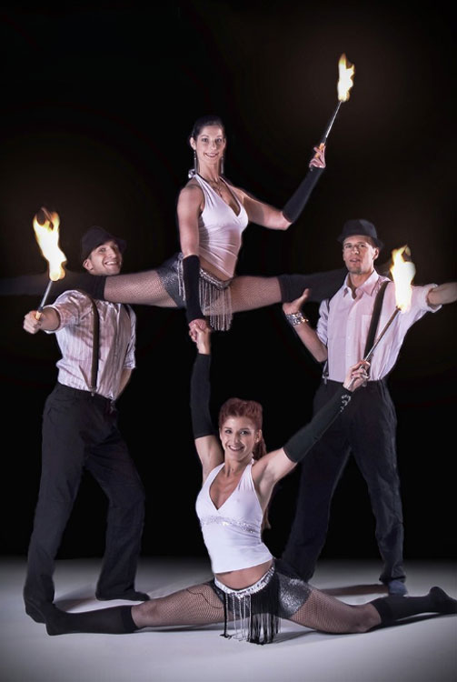 A fire jazz show that combines acrobatic dance with stunts, fire and partner work. Using a variety of different props our fantastic male and female fire dancers create stunning shapes in the air as they interweave burning hoops, whips and staffs in this dynamic and exciting performance.