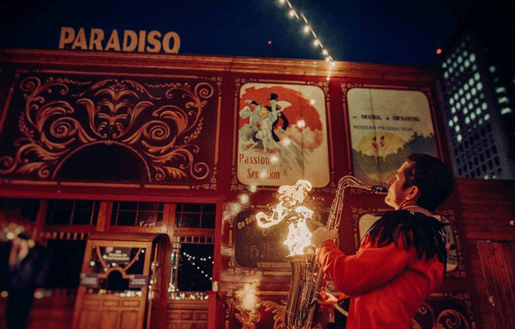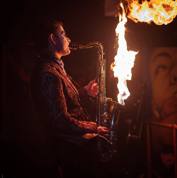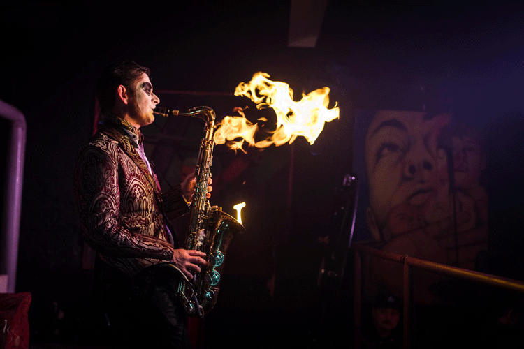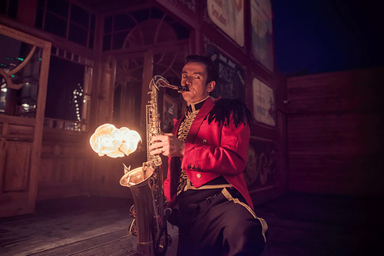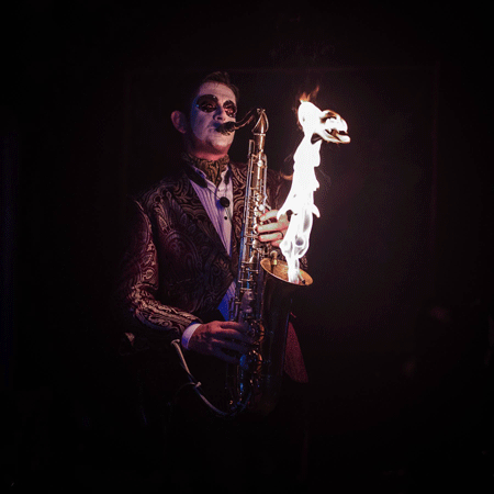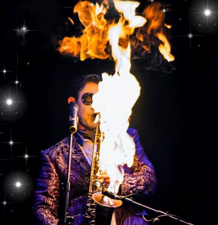 This Flaming Sax performance is guaranteed to get the party started and to warm up any crowd. Safer, cleaner and a lot more unusual than a conventional fire act, This flaming saxophonist can be hired as a stand alone stage act, a walkabout performance, a visually stunning accompaniment to your DJ/live band or a static musical attraction to welcome guests as they arrive. Guaranteed to leave your guests talking about what an amazing night they’ve had, this Sax performance will give your event a unique edge that makes it stand out from the rest.