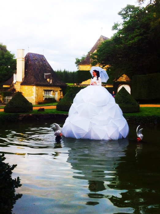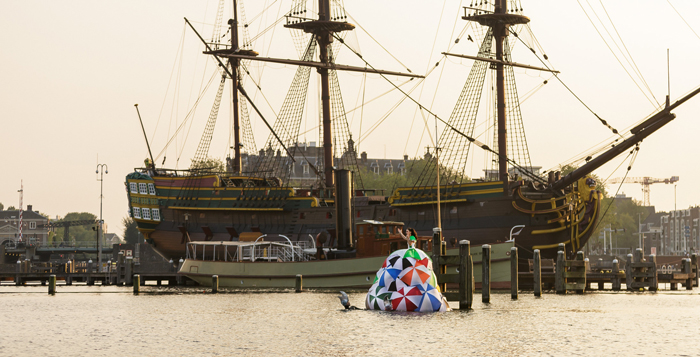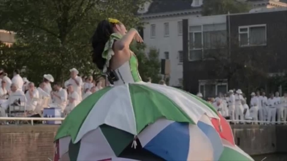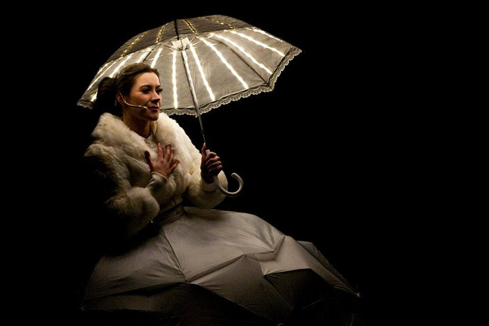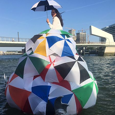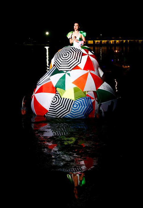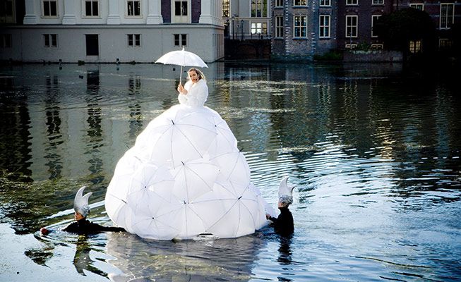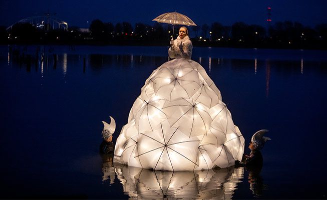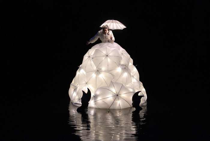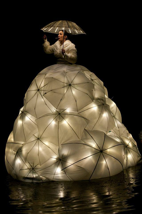 The totally unique classical singer wears an incredible dress made of umbrellas, either completely white or with vibrant colours. The design is inspired by sophisticated seventeenth-century fashion and Dutch history. The inside of the dress is filled with lights that illuminate the floating singer at night. She event has her own illuminated umbrella which can be used during the performance. With the act on water at night, it looks like the opera singer is floating in the dark abyss with the occasional flickered reflection of her dress on the shimmering water.