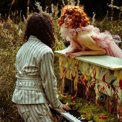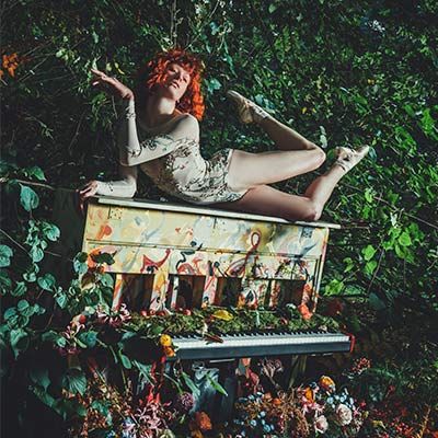 The musician makes use of a hand-painted piano prop adorned with fresh flowers and romantic motifs