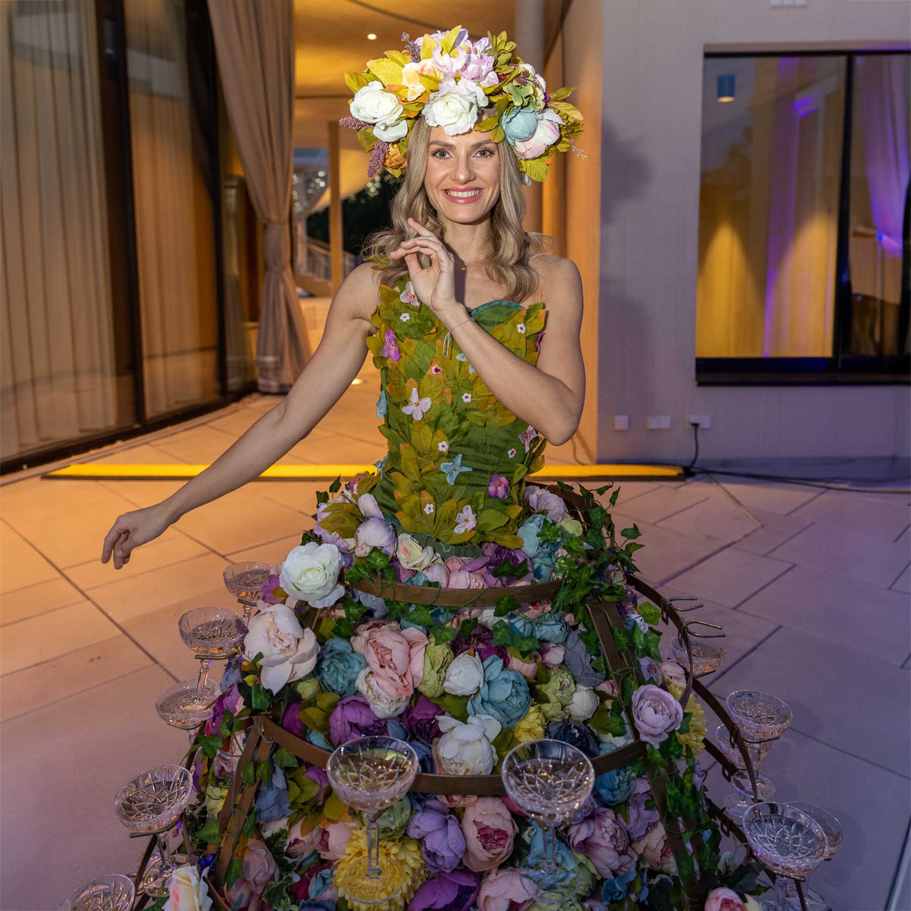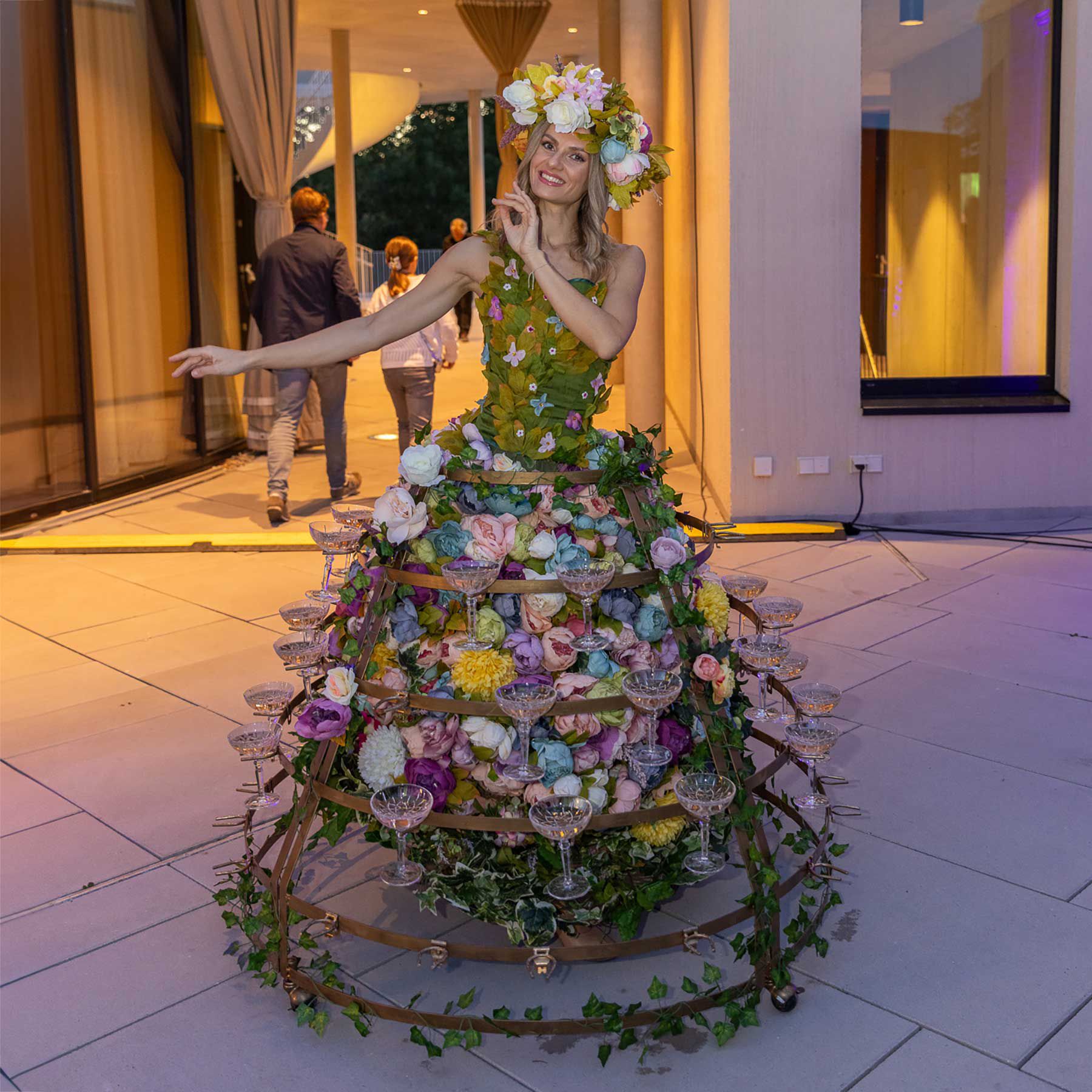 Beautiful floral-themed roaming Champagne dress to serve your guest drinks
