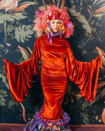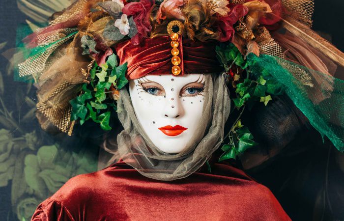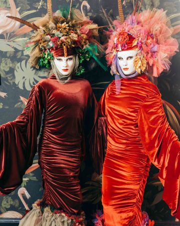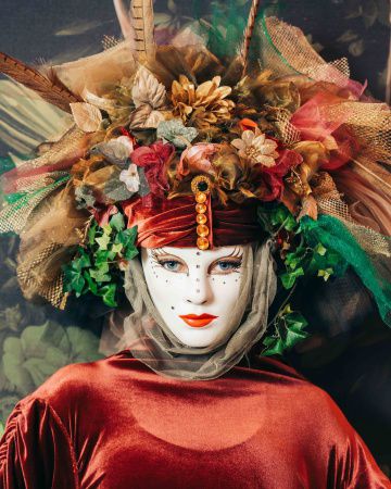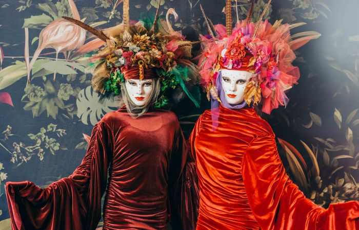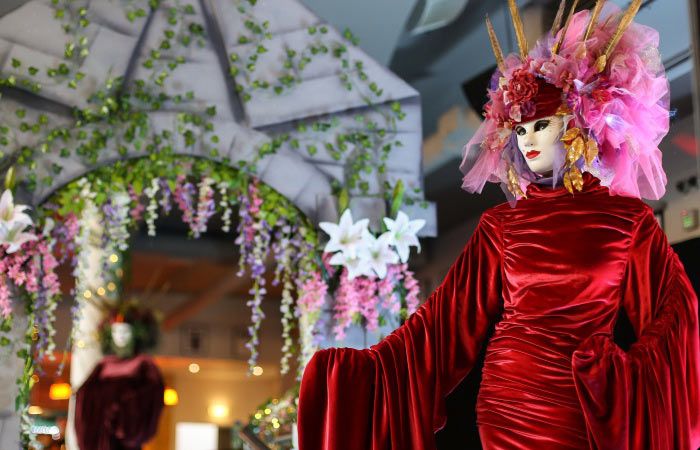 Wearing exquisite Venetian masquerade and royal-red costumes with flower ornaments, these floral-themed living statues turn heads at every event