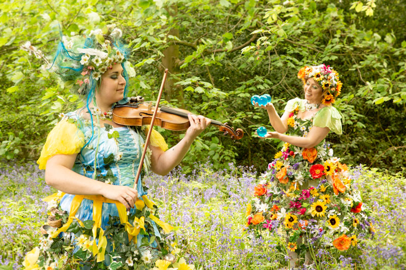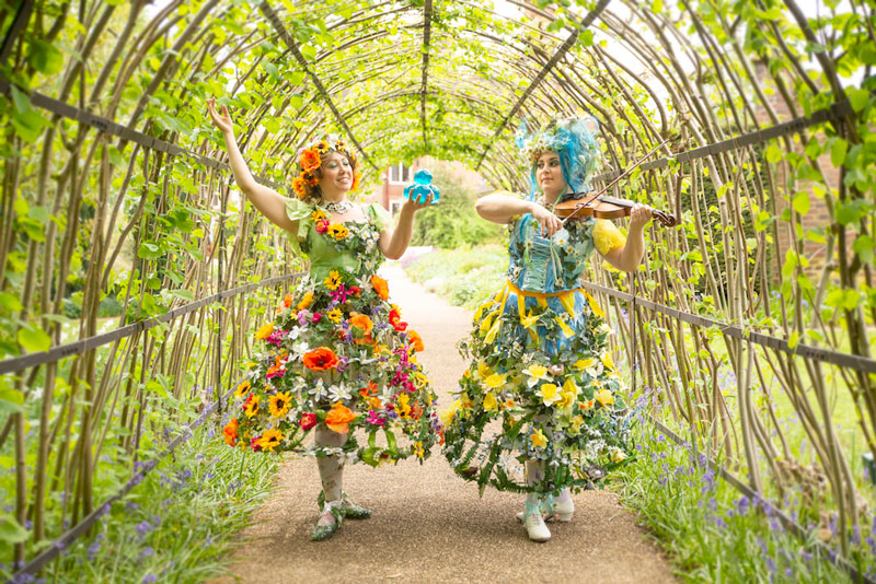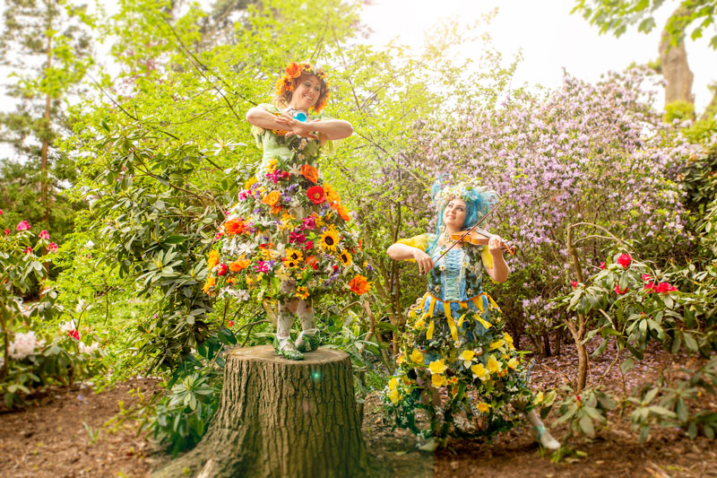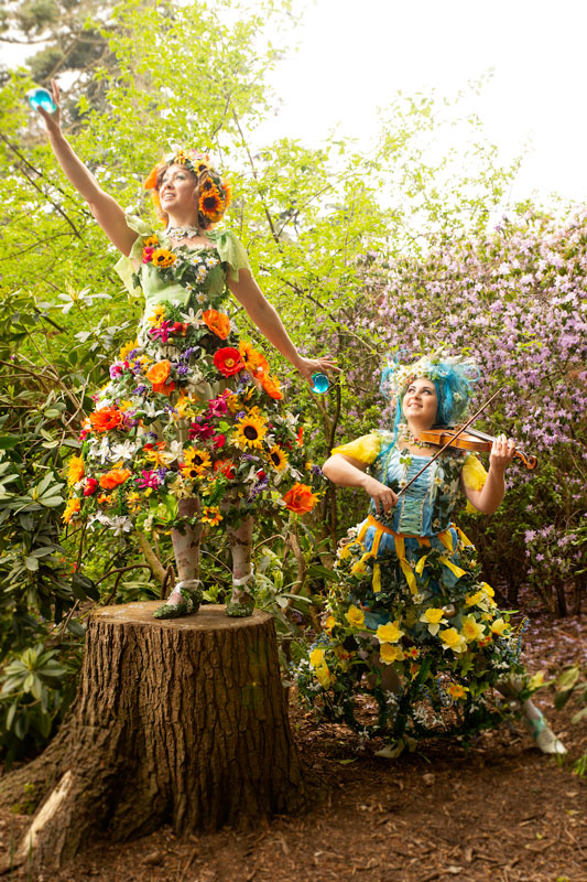 Stopping guests in their tracks, this charming pair will roam about your event showing off their stunning floral costumes. Intricately designed with dozens of flower heads, petals, buds and blossom adorning their skirts and headdresses, their flower-fairy appearance creates a perfect photo opportunity for guests.