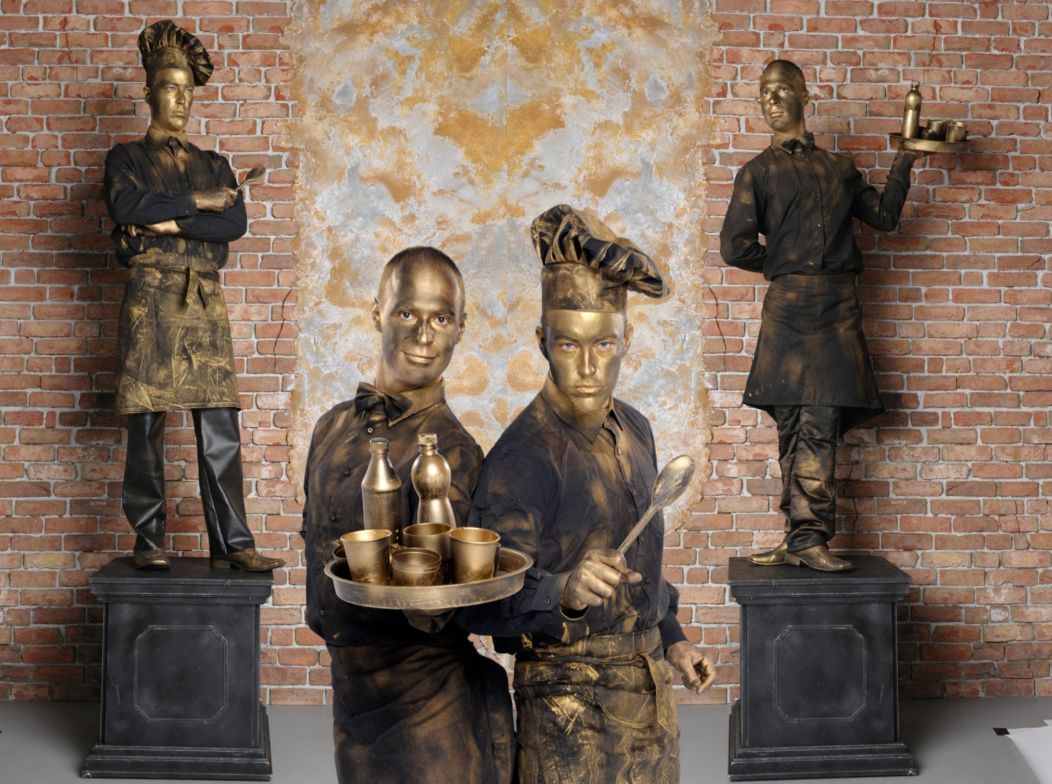 The waiter that waits, and waits and waits. Although he may not be able to come to you, he surely will be waiting on his pedestal. With his super friendly service, he is always ready to top up your order with a smile. Don’t forget about his friend - chef who always prepares something special for the menu! Create a culinary living decor, which is as awesome as it is unexpected! Made of bronze, our Chef & Waiter will be sure to "move" your guests. A surprise welcome, a prestigious setting... this is what our living statues promise for your event.
