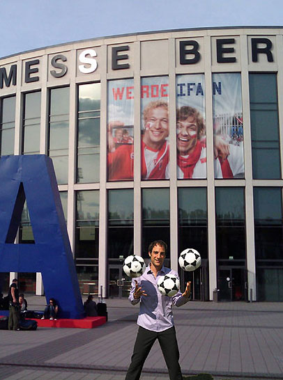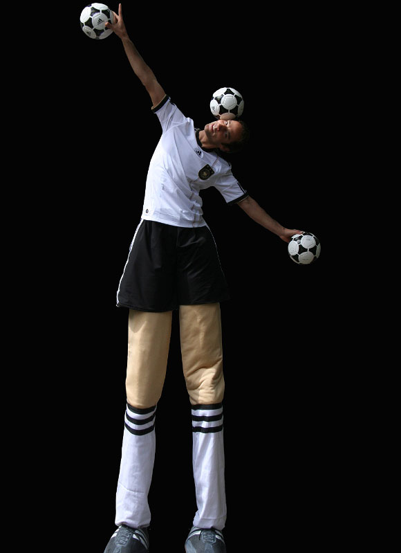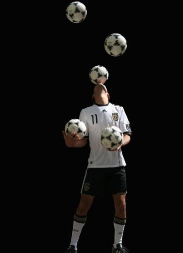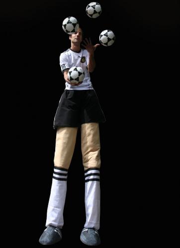 The virtuoso football juggler is at home entertaining tens of thousands of people at football events and matches, trade shows, corporate functions, gala dinners, private parties and as street entertainment. Tobias can also perform his juggling act on stilts as a "Giant footballer".