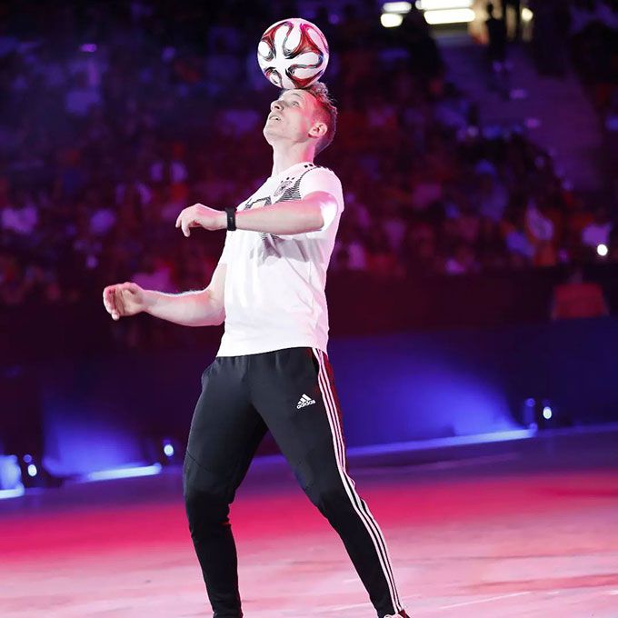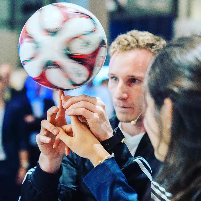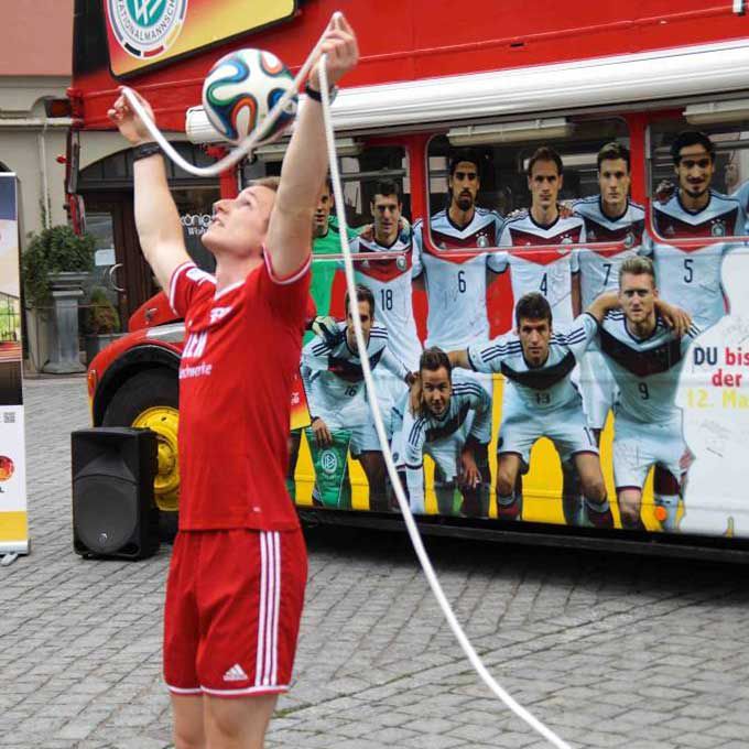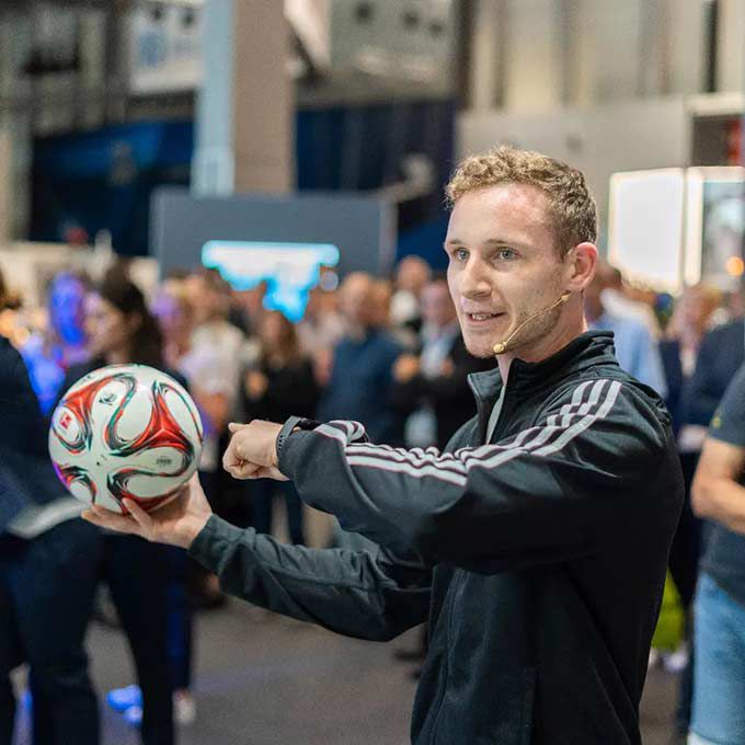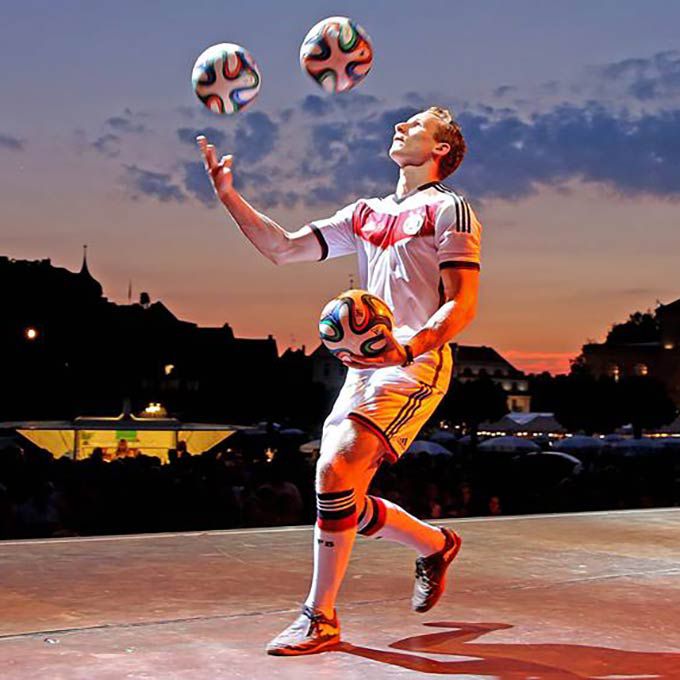 He enjoys interacting with the crowd as a football artist, entertains guests at your party and creates a great atmosphere at sporting events