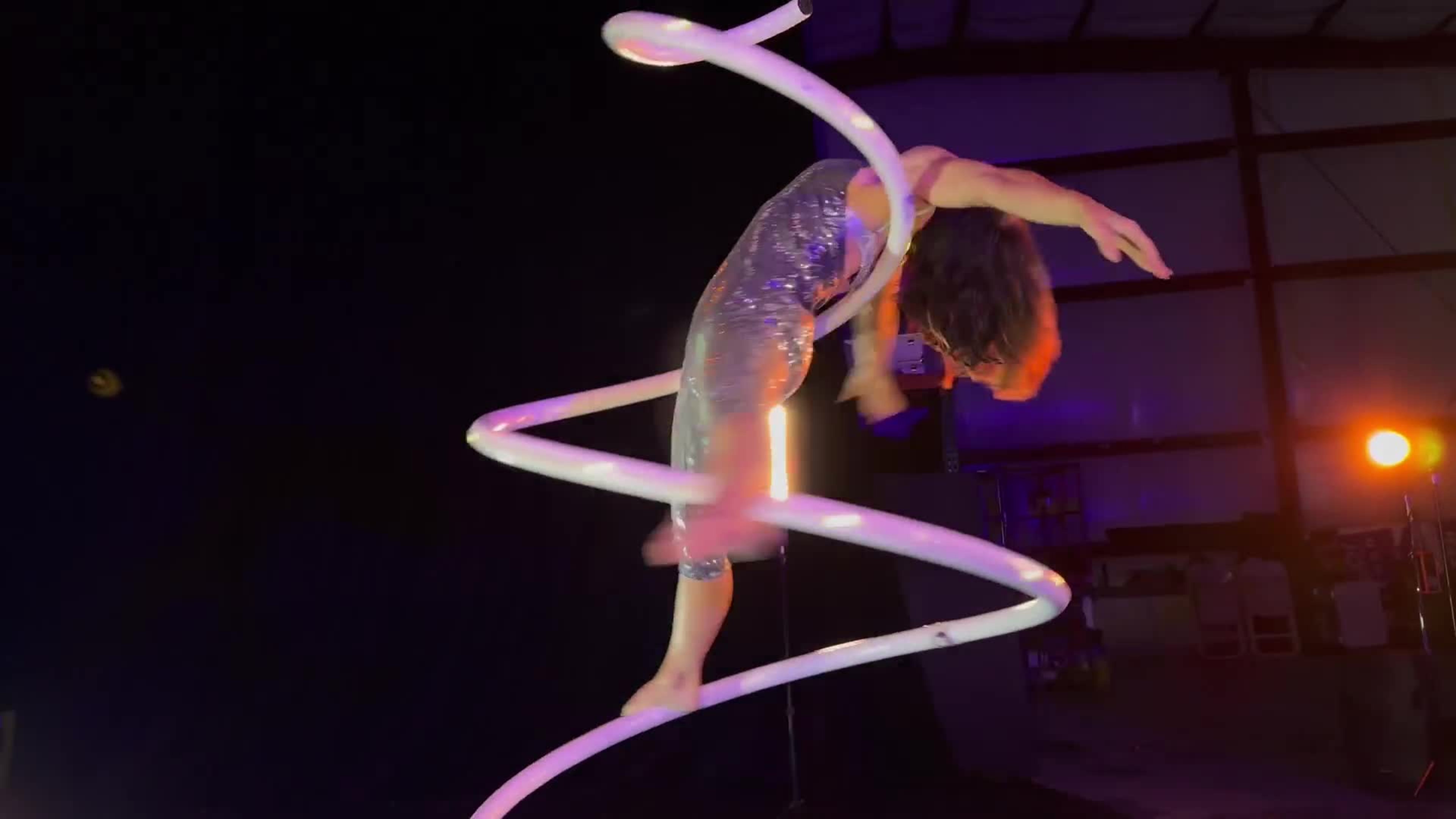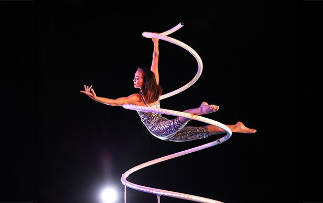 A mesmerizing aerialist brings elegance and grace to the freestanding spiral, captivating audiences with stunning fluid motion