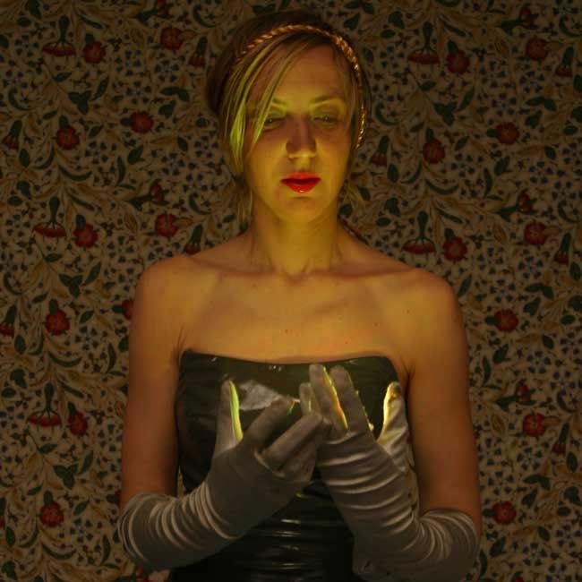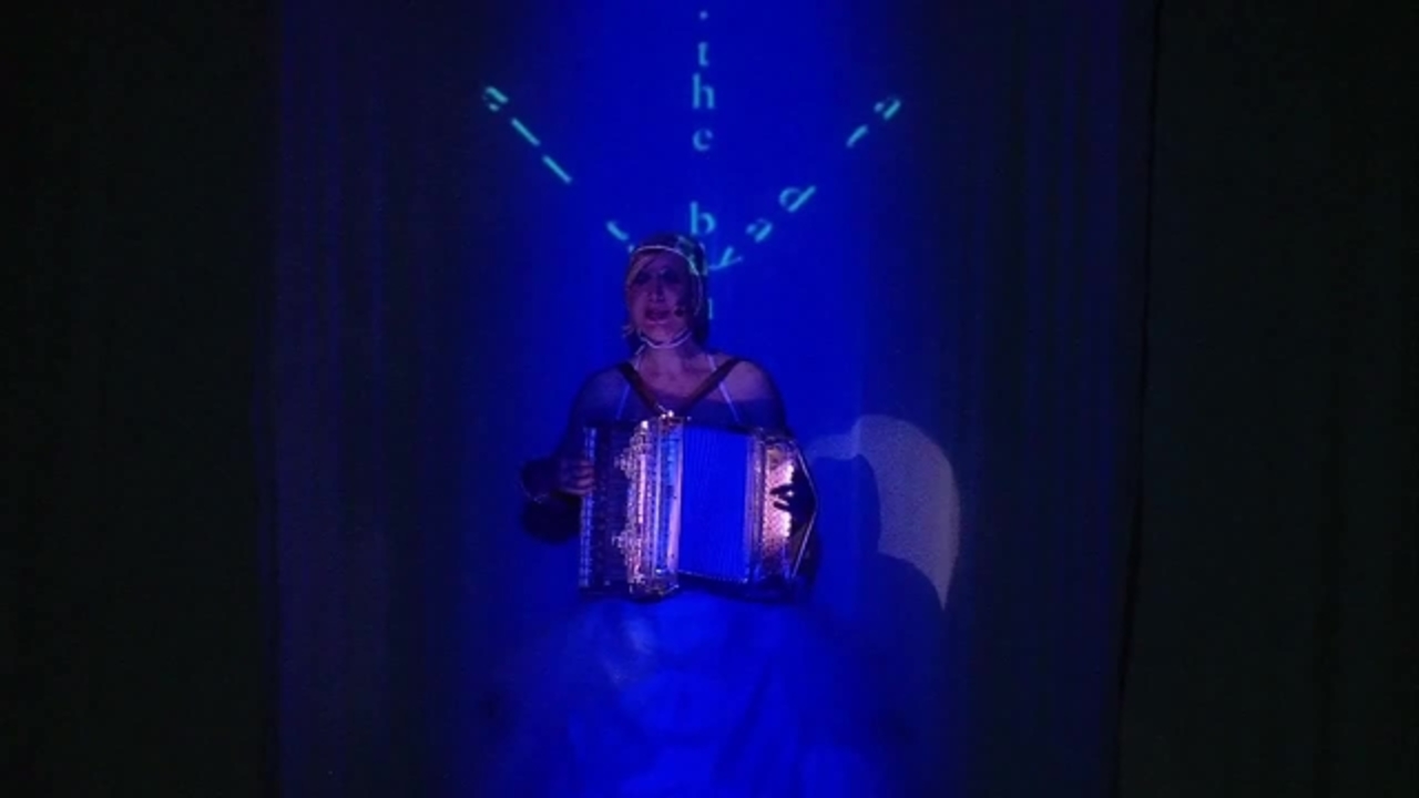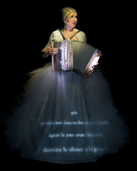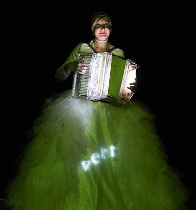 Her unique and highly original appearance is both mesmerising and compelling and along with her transparent luminous accordion designed for her by British artist Paul Etienne Lincoln she also has luminous shoes and costumes.