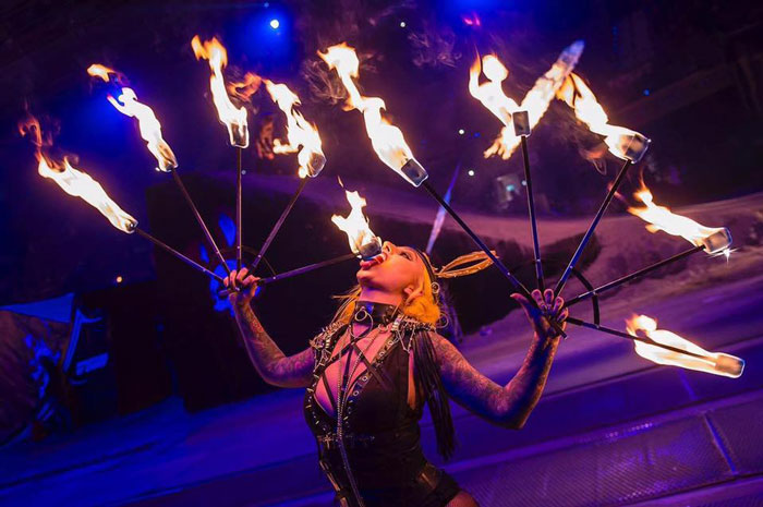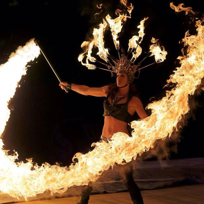 The fully customisable fire shows from the Fuel Girls includes an almost limitless supply of fire props such as fire sticks, fire poi, fire fans, fire whips, fire swords, fire hula hoop, fire breathing, sparkle fire, and even flame jet gun. The fire performers will create a bespoke routine especially for your event. To add to the grandeur of the fire show you can add some of the incredible aerial acrobats for that extra WOW factor. These aerial acrobats perform on silks, hoops, chains and even poles depending on your requirements. Not only do Fuel Girls offer tailorable routines but the fire performers and aerial acrobats can come in a variety of wonderful costumes and can be customised to suit many themes.
