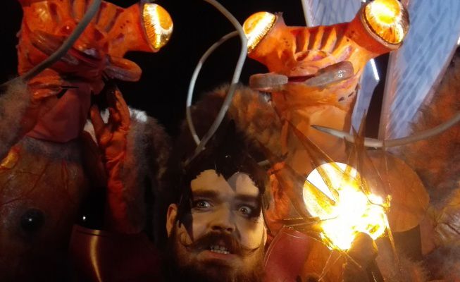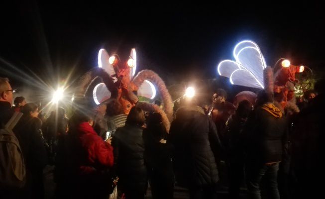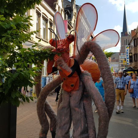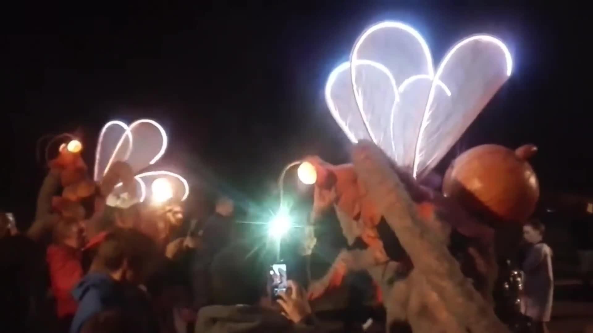 Our engaging street theatre performance is particularly striking in the evening when LED-lit eyes and wings bring the costumes to life