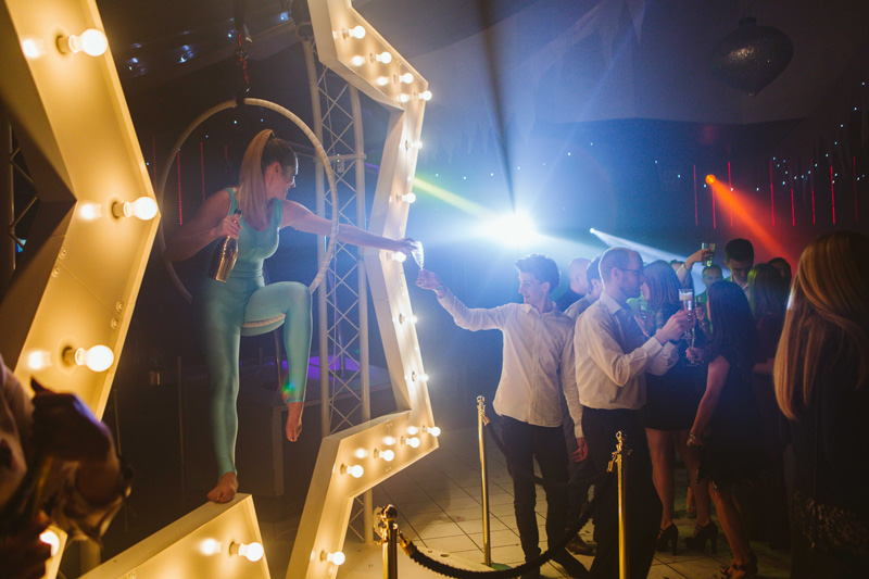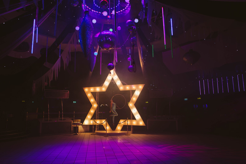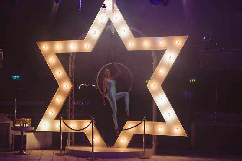 The star is put up with a rope swing that can support an aerial act. She can perform all sorts of functions for you, from pouring champagne for your guests to a choreographed aerial show. Her costume can be fully customised to include colour schemes or branding, and can be complemented by the colour of the LED lights in the giant star.