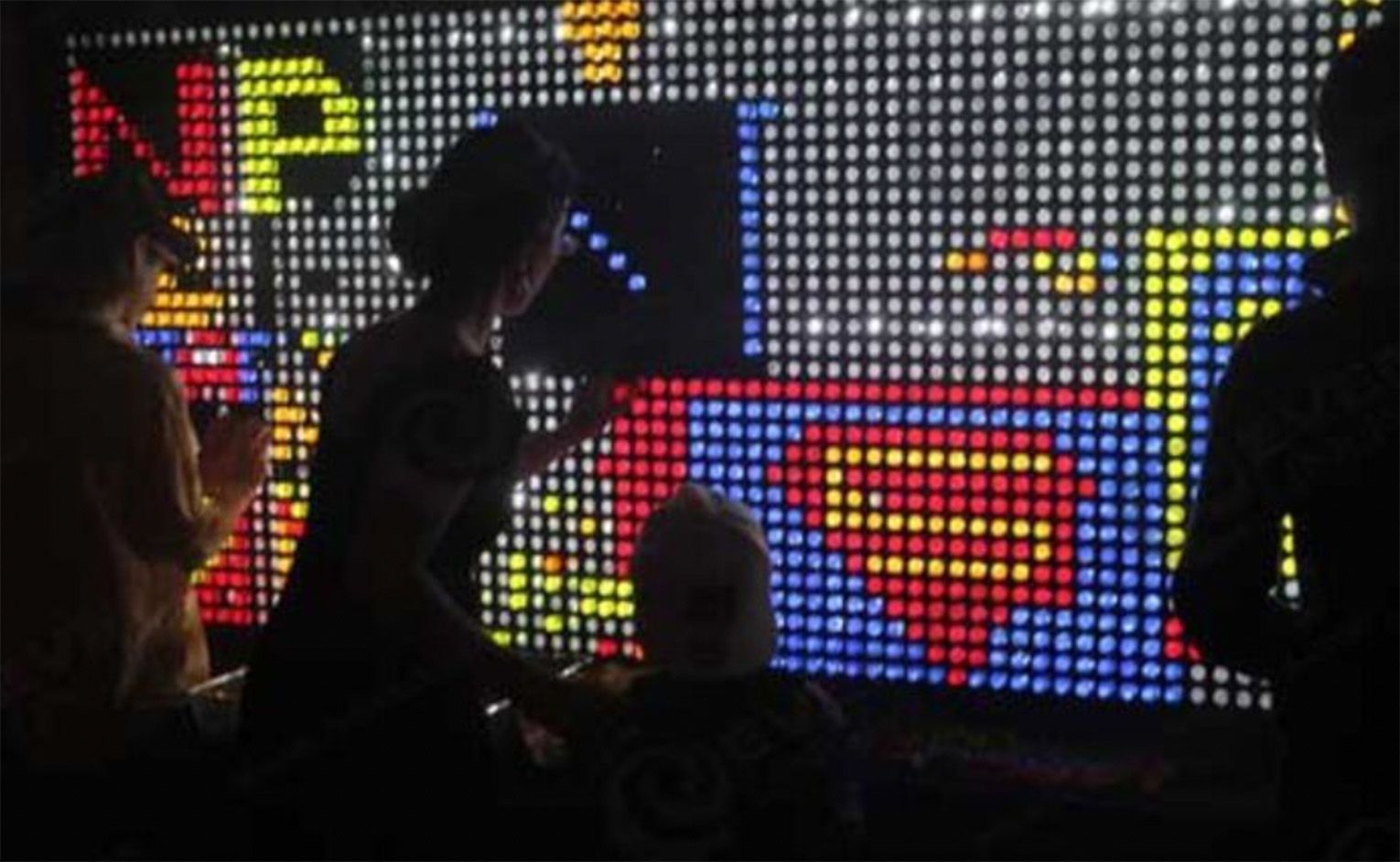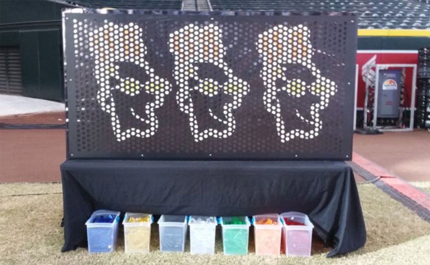 An 8ft wide by 4ft tall illuminated wall with thousands of round holes to be used to create a display with coloured pegs