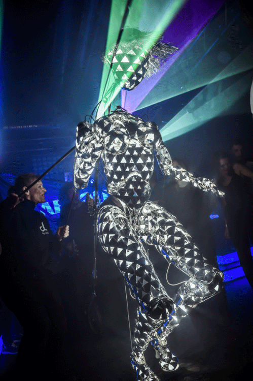 Handled and bought to life by a team of five experienced and professional puppeteers, our unique roaming character’s flexible, mirrored body comes to life and moves in perfect harmony with live music and/or your chosen soundtracks.