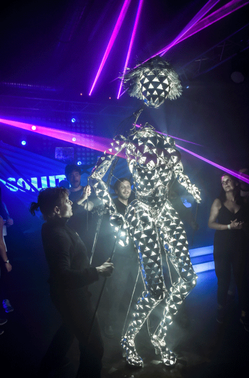 Our female puppet glows from within and refracts light making for event entertainment that also doubles up as a remarkable focal point amongst your decor.