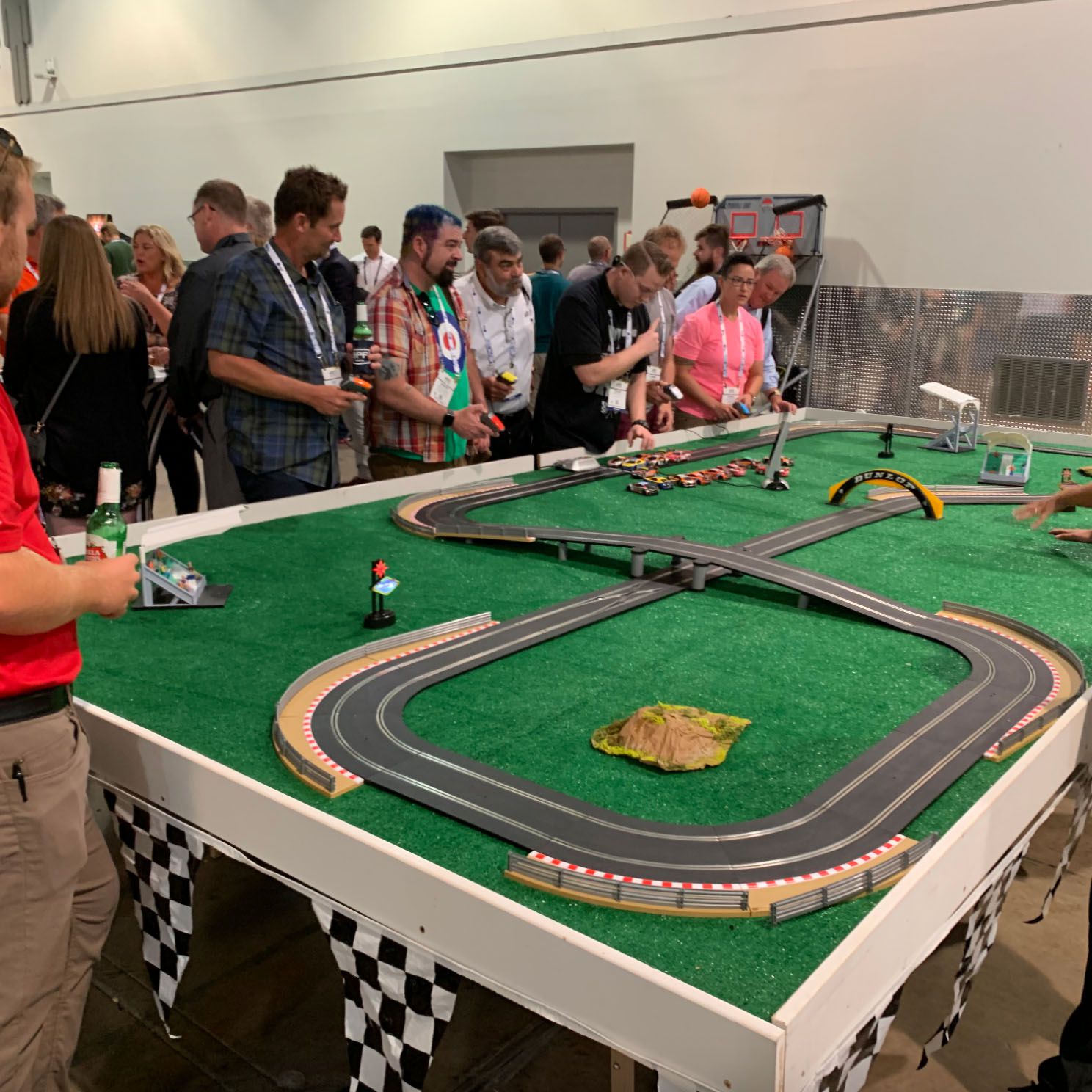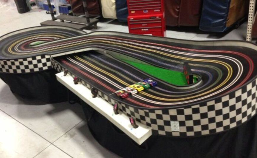 This freestanding track can come in different designs and allows two to six race cars to run at the same time on dual lanes. Guests control the speed of their cars with a hand-held controller. The set-up includes a built-in lap controller and allows for lane crossovers for a thrilling racing experience.