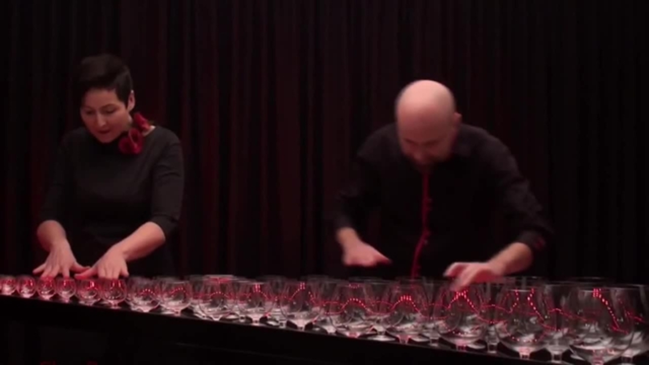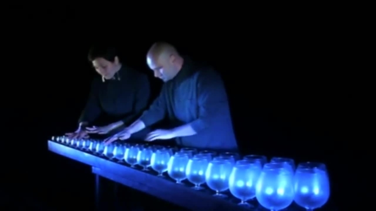 The duo’s instrument is in fact the largest glass harp in the world, covering nearly 5 octaves, and using empty glasses which have been professionally tuned so that they do not require water to make music.