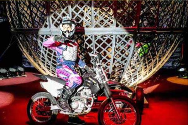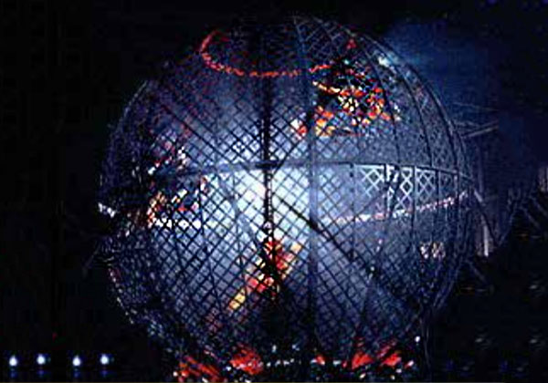 Death and gravity-defying motorcycle stunts in a fully enclosed mesh sphere