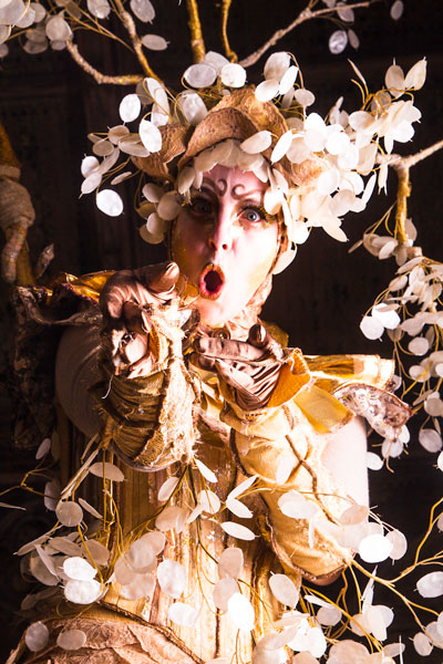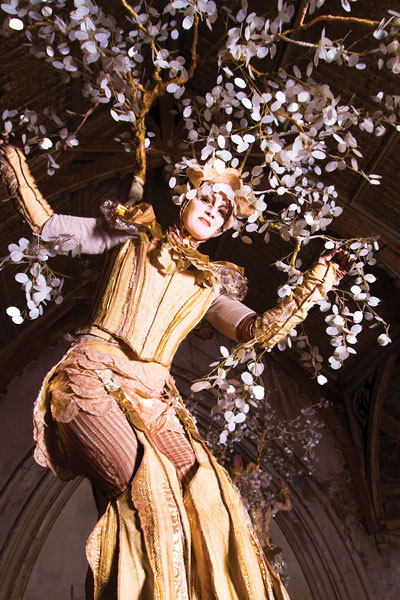 Their stunning golden costumes showcase elaborate and textured designs in the fabric on their bodices and that encase their 1.5 metre stilts. The overall look is completed with ostentatious headpieces that see golden branches adorned with shimmering white leaves soar high into the air. Our walkaround characters also boast beautiful make up in keeping with their costumes.