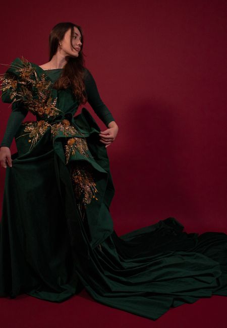 Dressed in a rich emerald green colour with showstopping contrasting gold leaves our Green Carpet Hostess creates a unique VIP guest arrival moment