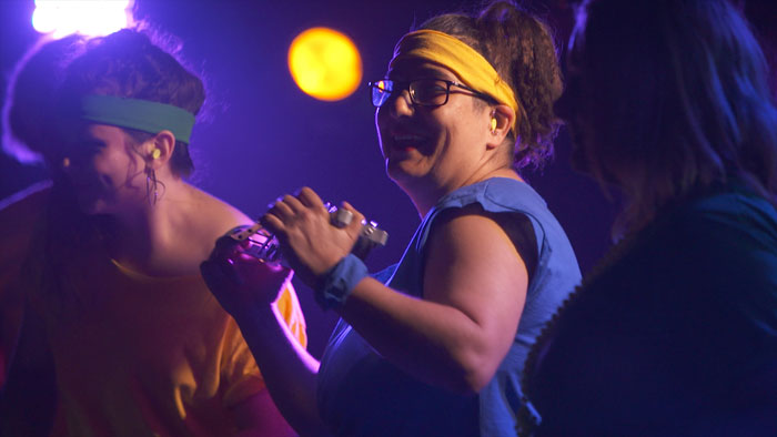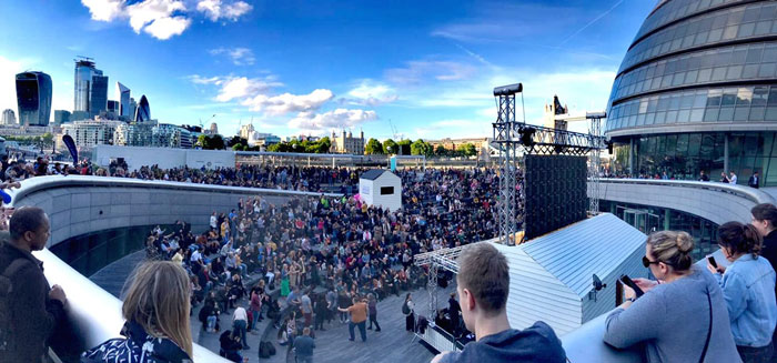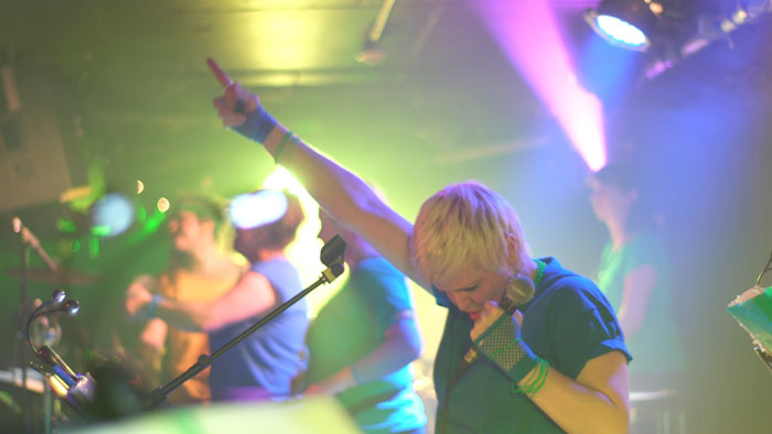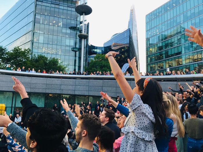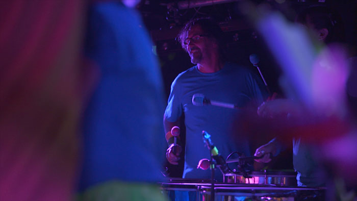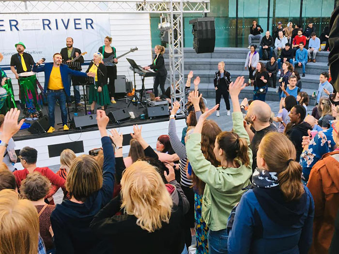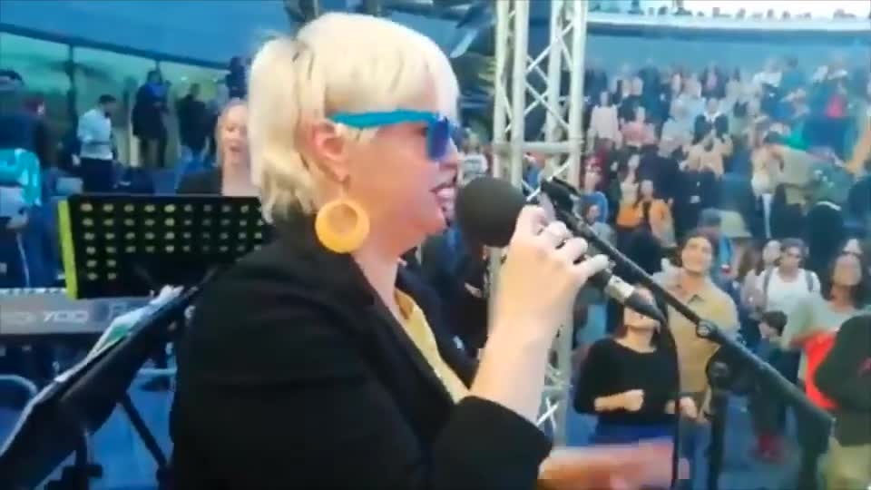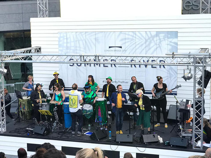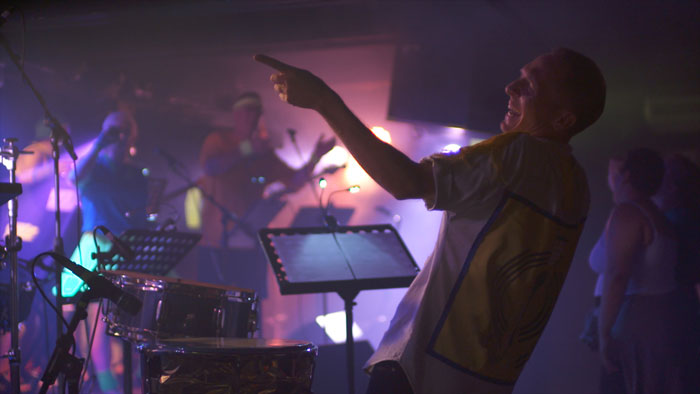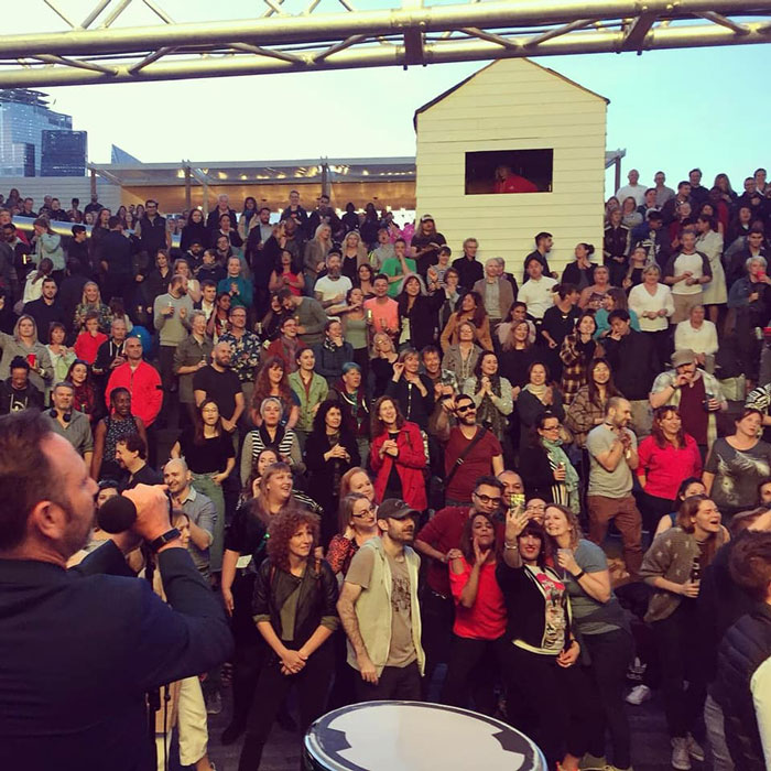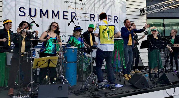High-energy and high-motivation mass audience karaoke singalong accompanied by a live samba band
