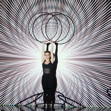Created especially for the audience of BBC1’s John Bishop Show, this chic act has gone on to be booked for a wide range of high profile events. Adding another level to traditional hula hooping shows, our circus entertainment act incorporates cutting edge technology into the performance. Using projection mapping technology, hula hoop shapes are cast in black across the screen while our performer dances, creating a striking effect rarely used for this sort of act.