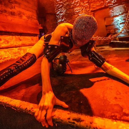 The genderless, masked four-legged creatures are living performances, blending high fashion, fetish-inspired elements, and avant-garde theatricality