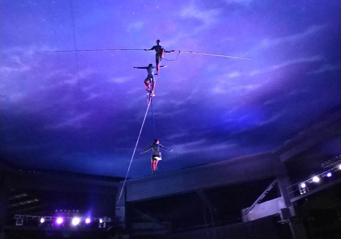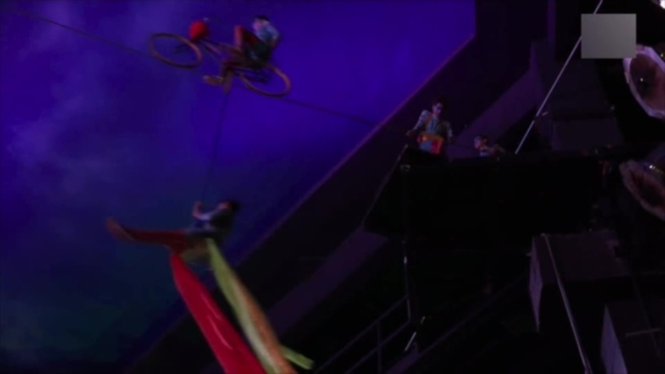 The cyclist is the focal point of this stunning aerial show. Even though he rides on an old vintage bicycle, it has been colourfully decorated to match the colours of the performers' costumes. A graceful aerialist with long flowing ribbons is attached to the bike and swoops over the crowds. A third high wire artist joins in and all three performs frightening balancing acts that keep the audience in complete awe. Even the cyclist can be seen balancing off his bike hundreds of feet above the crowd.