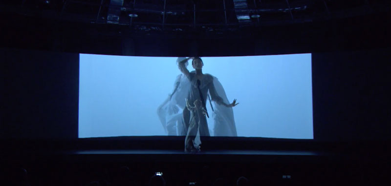 Pre-filmed models are combined with graphic elements and layered with real-life models on stage to create a striking three-dimensional and multimedia performance.