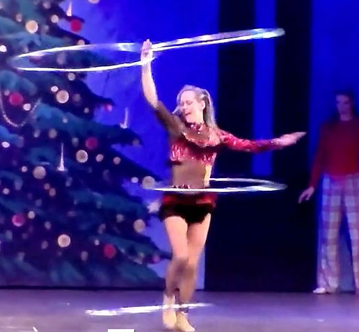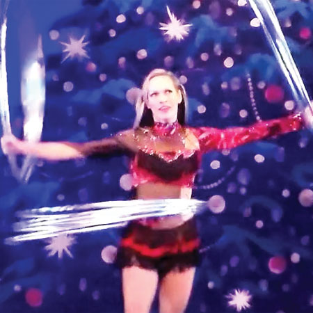 Specializing in high-octane hula hoop performances, our talented circus artist is able to incorporate LED hoops, fire hoops and even ice skating into her dynamic shows. Also a professional aerialist, she can include aerial web, fabric and static trapeze disciplines in varied her shows.
