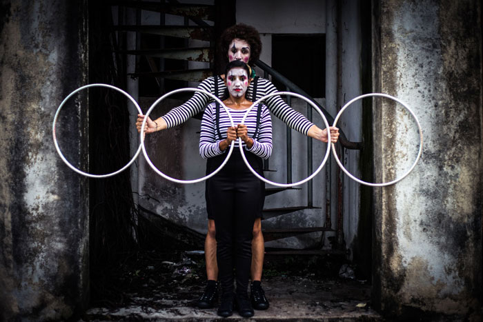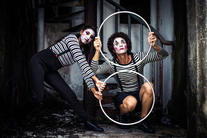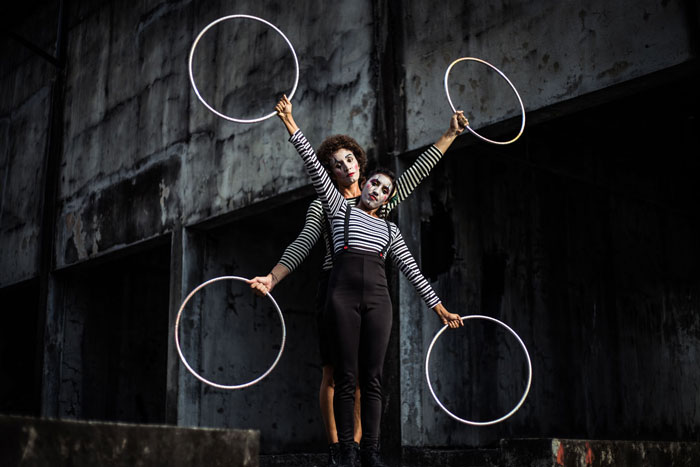 Dressed as a hybrid of clowns and French mime artist, the hoop performers have put their brilliant hula hoop skills into a captivating mini hoop act that is a real joy to watch. You will be hoopnotised by the amazing ma manipulation of the mini hoops and perfectly choreographed body movements.