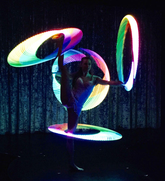 Looking to add an extra special touch? She also offers an LED hula hoop show which can be performed as a stand alone show or incorporated into the finale or her traditional hula hoop performance.