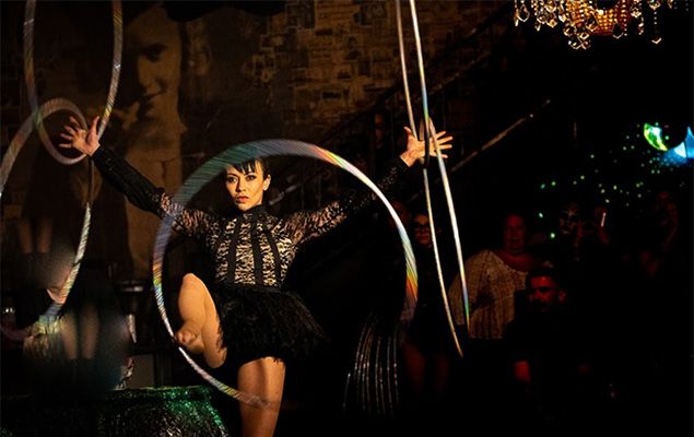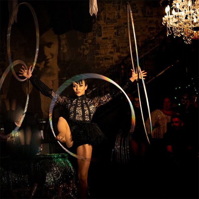 A featured Spiegelworld performer, she whirls hoops into unforgettable shows, weaving elegance, rhythm, and artistry that leave crowds spellbound