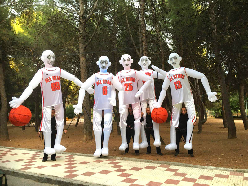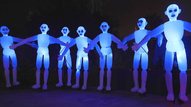 Impossible to miss, even in the busiest of environments, the Inflatable giants are more than 4 meters high. The inflatable giants are generally just big white human characters but they can be dressed up in a variety of fancy costumes to personify them or customised for a specific event, as you can see in the photos and video. Available from just one to eight inflatable giants, the walkabout act also includes in-built LED lights with RGB colours that beautifully change as they roam around. Once inflated, the inflatable giants are attached to performers who can make them walk and move the arms about.