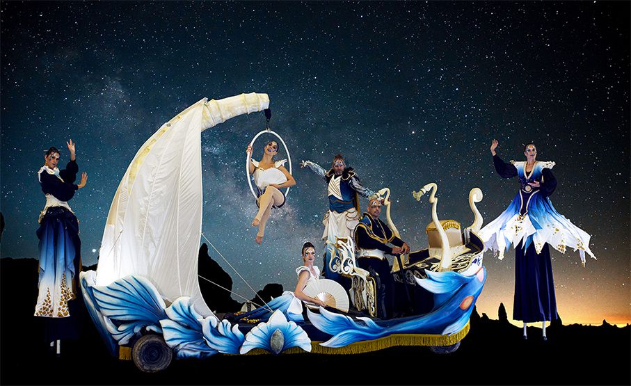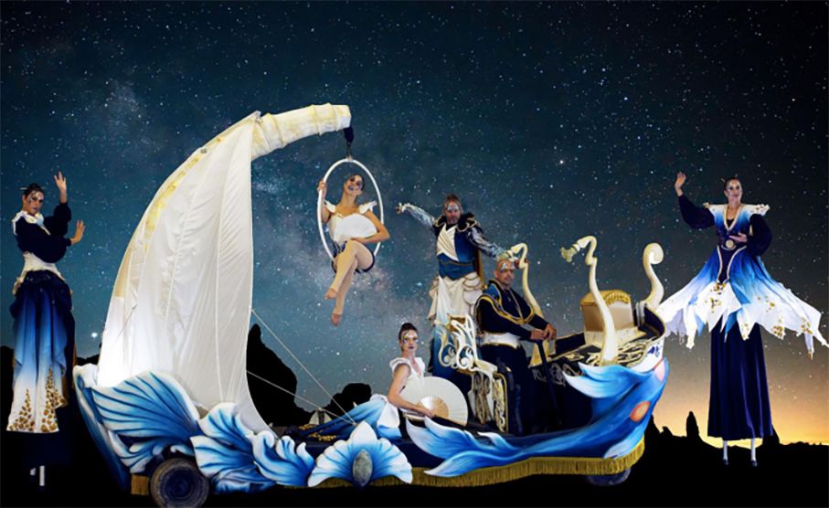 Majestic stilt walkers, graceful dancers, an aerial hoop artist, and a glowing musical float create an unforgettable, dreamlike spectacle