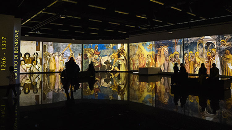 Our multimedia galleries are 360-degree projection panoramas of about 15,000 sq ft with 46.9 Mpx resolution, 52 projectors, and one iPad-controllable media-server. These multimedia installations can be adapted to different venue sizes and destinations and the spaces can be used for art or photo galleries, education programs, interactive multimedia shows, or even musicals.